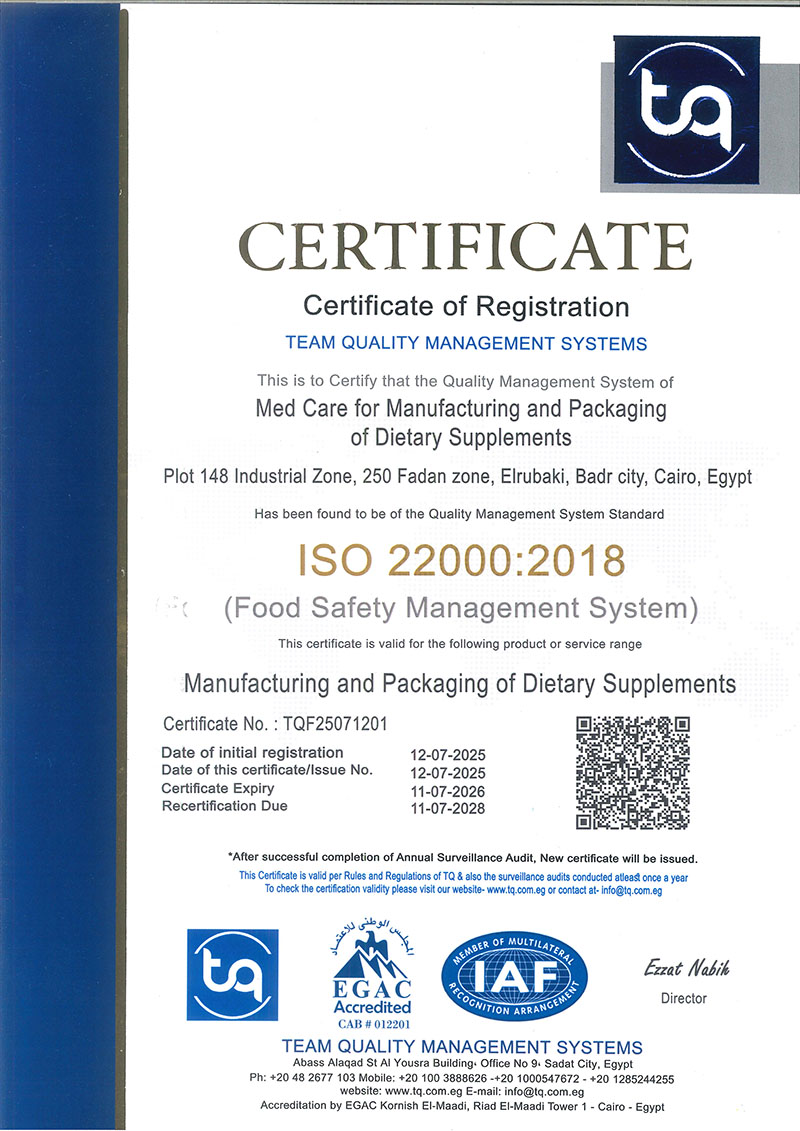 ISO 22000 Certificate for Med Care Factory