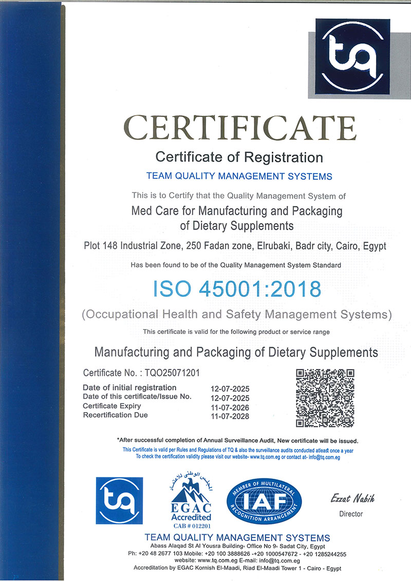 ISO 45001 Certificate for Med Care Factory